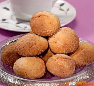 Противень накрыть листом пергамента. Насыпать немного сахара на тарелку. Смазать руки растительным маслом. Взять немного получившегося теста, скатать в шарик. Обмакнуть в сахар и выложить на противень. Так же сформировать все печенье. Поставить в разогретую до 160°C духовку на 20 мин.