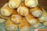 Тесто разделить на 20 кусочков, раскатать каждую в тонкий квадрат около 15 см, выложить в центр по 1 ст.л. начинки, свернуть квадраты конвертиками.