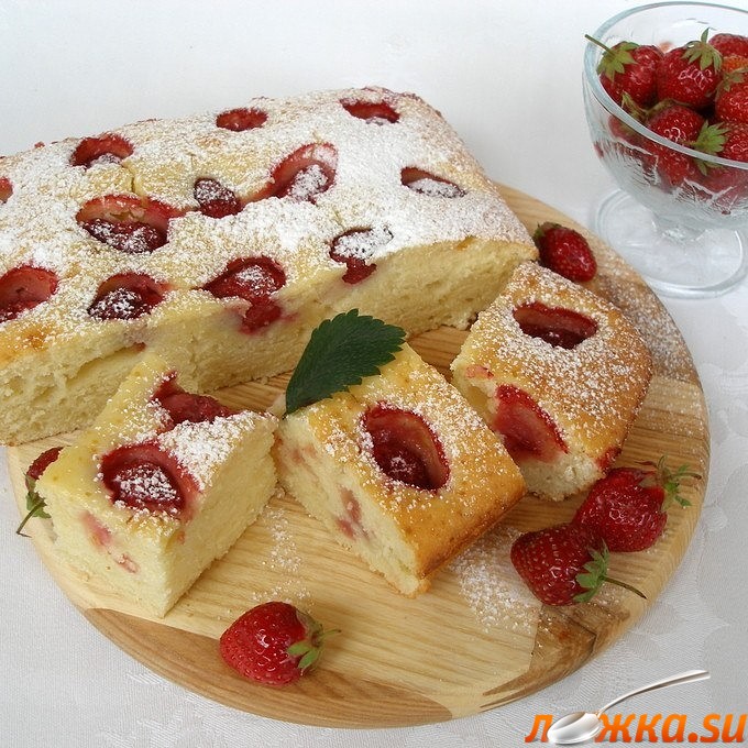 Форму для выпечки смазать маслом, вылить в нее тесто, распределить равномерно. Уложить ягоды клубники, слегка вдавливая их в тесто.